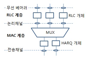 ㅇ 여러 논리채널(각각 RLC 개체와 연결됨)들이 하나의 전송채널로 다중화