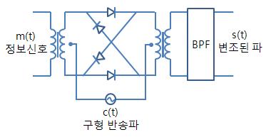 1. 링 변조기 (Ring Modulator) ㅇ DSB-SC 파의 생성에 적합한 곱셈 변조기의 일종 - 반송파 억압(Carrier Suppression) 변조라고도 불리움 2. 링 변조기 구조 ㅇ 4개의 다이오드가 동일한 방향으로 링 구조를 형성 - 링 변조기는 마치 정류기(Commutator) 처럼 행동함 . 다이오드 스위칭은 주파수 fc의 구형파 반송파에 의해 제어됨 .. 반송파 신호는 2개의 변압기 중간 단자에 인가됨ㅇ 개념적으로 정보신호와 구형 반송파를 곱해 DSB-SC 신호를 발생시킴 ㅇ 이중 평형 변조기(Double Balanced Modulator)라고도 함 - 정보신호 m(t) 및 반송파신호 c(t) 모두에 대해 평형을 이루고 있기 때문