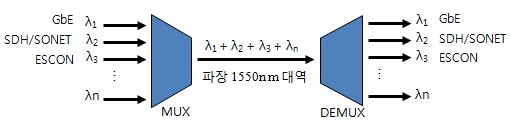 - 하나의 광섬유에, 입력 채널 신호들을 각기 다르게 할당된 채널 파장대역을 통해,