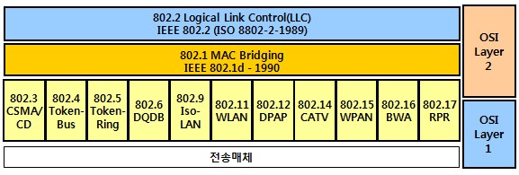 OSI 참조모델의 7 계층중 하위 2 계층(데이타링크 계층, 물리계층) 만을 대상으로 함